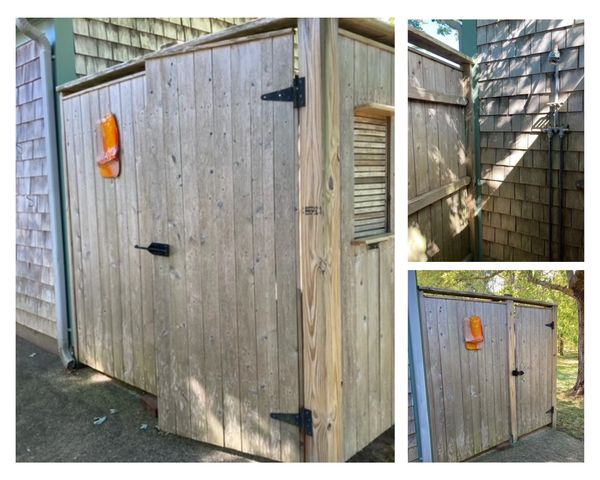 Experience a quintessential Cape Cod tradition: the private outdoor shower. This essential amenity is a key feature of our Brewster cottage, offering the perfect way to rinse off after a day at the beach or a swim in the pond. The outdoor shower provides both hot and cold water for your comfort, a convenient amenity perfect for washing away sand before you even step inside. It's a truly refreshing and authentic highlight of your Lower Cape vacation rental stay.