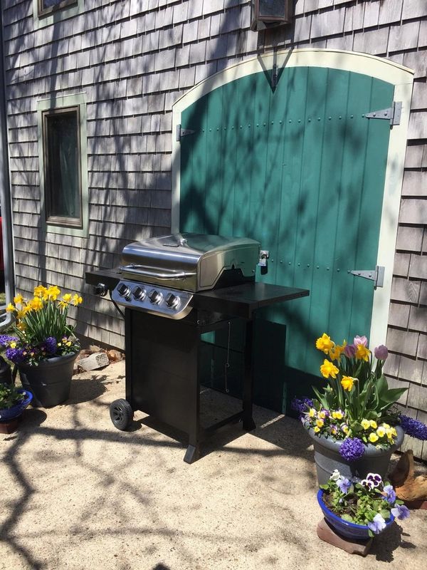 Our outdoor grill is perfectly situated for a scenic Cape Cod cookout. Enjoy the convenience of a modern grill with a view of Cobb's Pond, making it easy to prepare meals while taking in the beautiful scenery. This Brewster vacation rental offers the perfect spot for al fresco dining and summer barbecues.