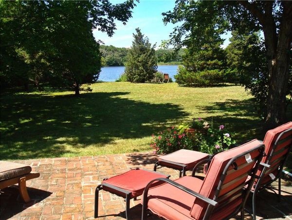Step outside the living room onto your private brick patio, a spacious and serene spot designed for outdoor living. This Cape Cod vacation rental offers a spectacular view of Cobb's Pond, framed by a lush lawn and mature trees. With an outdoor dining table for six, comfortable patio chairs, and teak loungers, you have everything you need to enjoy a morning coffee, an al fresco meal, or a peaceful afternoon of sunbathing with a picturesque waterfront view at our Brewster cottage.