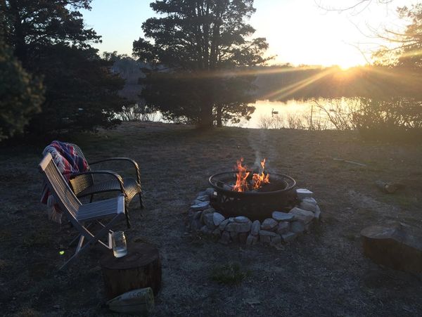 As the day winds down, gather around the outdoor fire pit for a truly magical evening. Nestled on the edge of the lawn, just before the shore of Cobb's Pond, this Cape Cod vacation rental on the water is the perfect spot to relax and take in the sunset view. You can pull up a chair, wrap yourself in a blanket, and watch the sky turn brilliant shades of orange and pink over the water. It's an unforgettable way to end a perfect day at our Brewster cottage rental. We even supply the wood to make it easy for you to enjoy a fire.